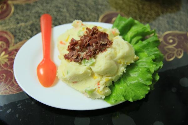 制作方法:將土豆洗干凈、去皮,玉米洗干凈,然后一起放入鍋中蒸熟;將蒸好的土豆放入保鮮袋中,用搟面杖搟成泥,玉米脫粒,備用;胡蘿卜、黃瓜、火腿切丁,放入開水中焯一下,撈起備用;將所有材料混合在一起,加入適量鹽和3勺沙拉醬,拌勻即可。