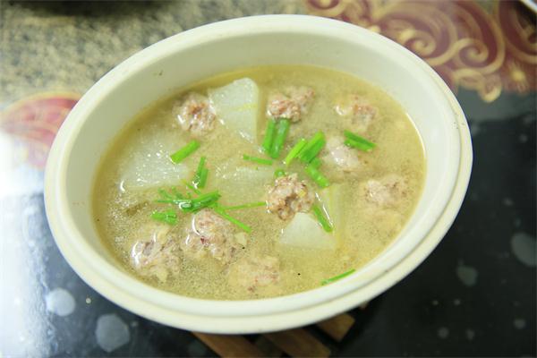 制作方法:夾心肉洗凈、剁碎,火腿切丁,生姜切末,備用;將上述材料混合,加入適量鹽、糖和料酒,再加入一個蛋清,用手混合均勻,再反復(fù)摔打至少10分鐘,至肉有彈性,再捏成大小適宜的小球,備用;豬大骨熬湯,備用;冬瓜洗干凈、切片,起油鍋略炒,加入大骨湯,燒開后逐一放入肉丸,再根據(jù)個人口味加入鹽等調(diào)味料,待肉丸燒熟即可起鍋。