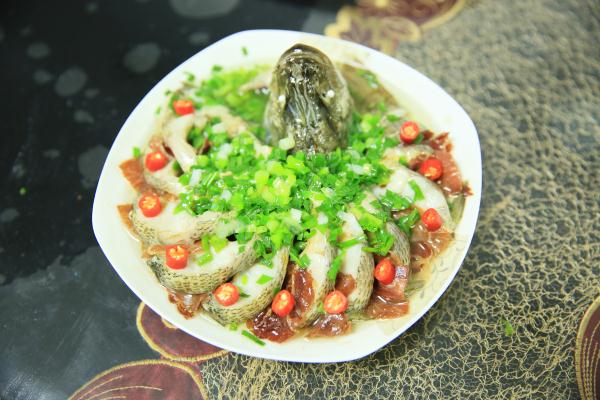 制作方法:鱸魚洗干凈,先將魚頭切下;剪掉魚鰭,從頭部開始,用刀從魚背往魚腹切到魚尾處,切忌不可切斷;將鹽和料酒制作成的混合物抹遍魚全身,腌制15分鐘備用;生姜、蔥切絲,墊在盤子底部,將腌好的魚擺出孔雀開屏的造型,魚頭放在最前面,尾巴部分也可單獨切下來,放在魚頭下方;擺好造型后,在每一塊魚肉中間夾入一小片火腿,再在魚上鋪一層姜蔥絲,冷水入鍋,大火蒸10分鐘即可出鍋;出鍋后,去掉上面的姜蔥絲,淋上一點生抽,再放上適量蔥末;鍋內(nèi)倒油,燒熱后淋到魚上,再放上若干紅辣椒裝飾即可。